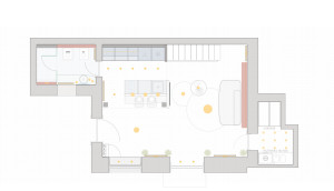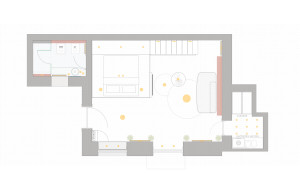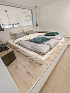 A nagy belmagasságnak köszönhetően a konyha felett kialakított galérián kényelmes hálószoba kapott helyet.